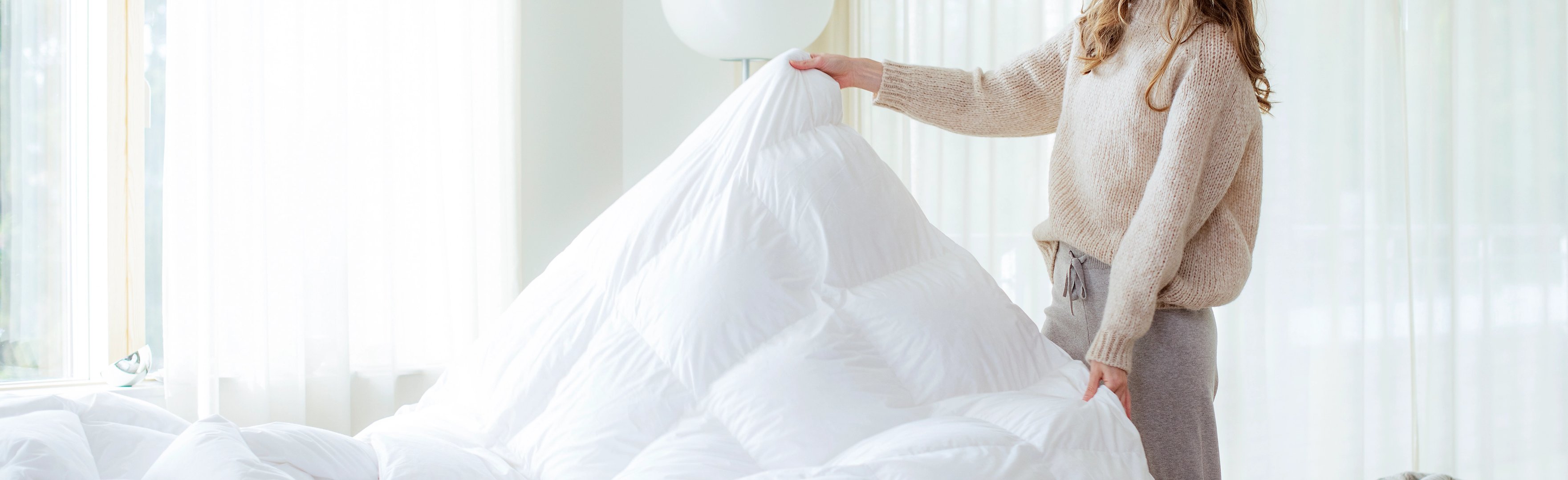 Har man valgt seg en helårsdyne kan man fortsatt gjøre mange tiltak for å justere varmefølelsen opp og ned. Sengetøyet og lakenet kan påvirke følelsen med noen enkle grep. En helårsdyne med flanellsengesett vil være varmere enn en helårsdyne med sengetøy i krepp. I de kaldere månedene anbefaler vi flanell for å skape en varmere opplevelse. Velger man et laken i flanell, sammen med et flanellsengesett - har man lagt alt til rette for det ideelle vintersoverommet. For de varme sommerdagene er det krepp som Ara og Pure som vil gi deg en deilige, luftige følelsen. En kjøligere touch får man med sateng som Milano. Perfekt for sommerkvelder som bare varer og varer.
